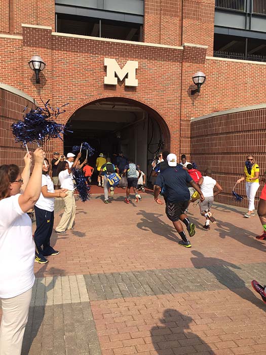 our timed Mathematics and untimed English comprehension academic pre-testing both with Marines, football players and teachers circulating. What was very special was that each of the young boys had a name tag, a uniform and a varsity Michigan locker inside the team locker room at the Big House that they will be using every day. The excitement was contagious as they turned from street clothes coming from over 20 different schools in Detroit to one team, with one uniform on the field of Michigan Football. The boys loved it, after lunch and an inspirational real-time talk by each of the Marines, they toured the University of Michigan campus and athletic facilities.