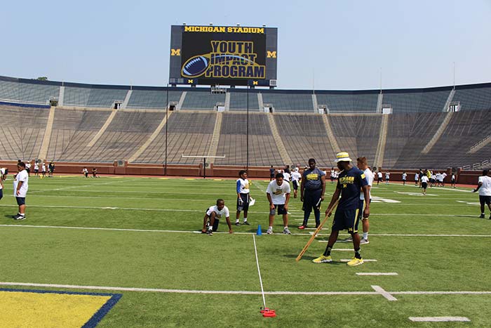 Michigan Head Coach Jim Harbaugh woke up at 4:30 am to meet 58 of our “at-risk” boys in the inner city of Detroit, got on their school bus with them and rode to Ann Arbor to open the first day of the Michigan Youth Impact Program. We had two buses from Detroit and a total of 103 “at-risk” boys which Coach Harbaugh brought together with 6 Marines, 4 public school teachers and his entire sophomore football class on the 50-yard line in the Big House to start up the day.